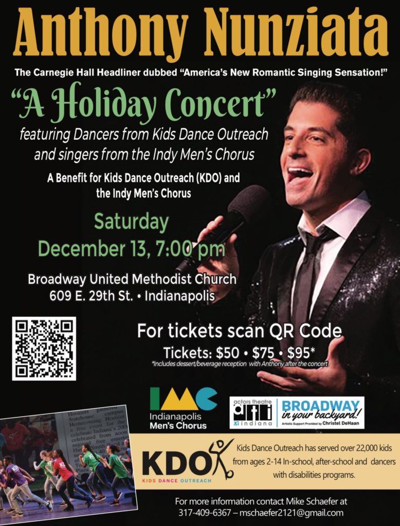 On December 13th, Broadway United Methodist Church proudly hosts Anthony Nunziata: “A Holiday Concert”, featuring special guest Ashley Nicole, Soprano—all in support of Actors Theatre of Indiana.